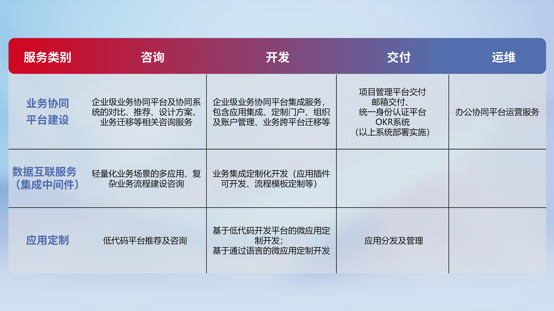 针对钉钉、、、企微、、、IDaas等平台级产品提供产品的规划、、方案、、交付、、、定制化开发等服务,,实现如统一协同办公、、、、智能客户服务、、、、混合会议管理、、、智能数据查询、、等业务场景,,实现数字化转型。。